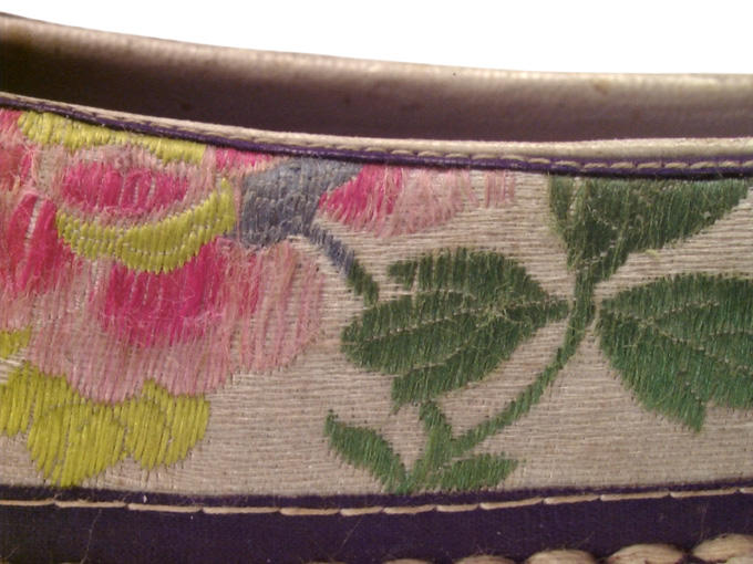 Ballerines en satin blanc décoré de fleurs. Bout relevé en satin violet. Semelle en cuir de buffle