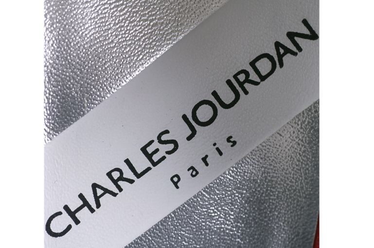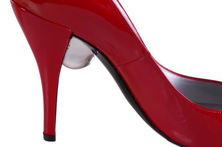 Escarpin de femme de type Charles IX en vernis rouge. Décor de boule de plexiglass translucide sur l’empeigne. Doublure de chevreau argent. Très haut talon aiguille recouvert et semelle de cuir noir. Décor de boule inserrée dans la gorge que forme la rencontre du talon et la semelle. Pied gauche