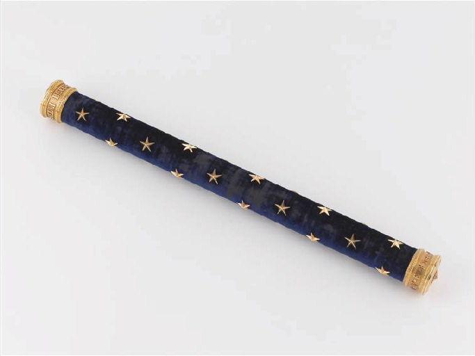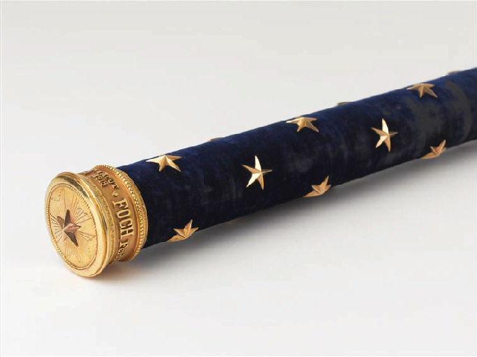 Bâton recouvert de velours bleu roi, semé d’étoiles d’or. Il est garni aux 2 extrémités de viroles d’or avec inscriptions. Il est conservé dans un étui cylindrique en cuir rouge signé CARTIER, avec une inscription dorée : AU MARECHAL FOCH 6 AOUT 1918